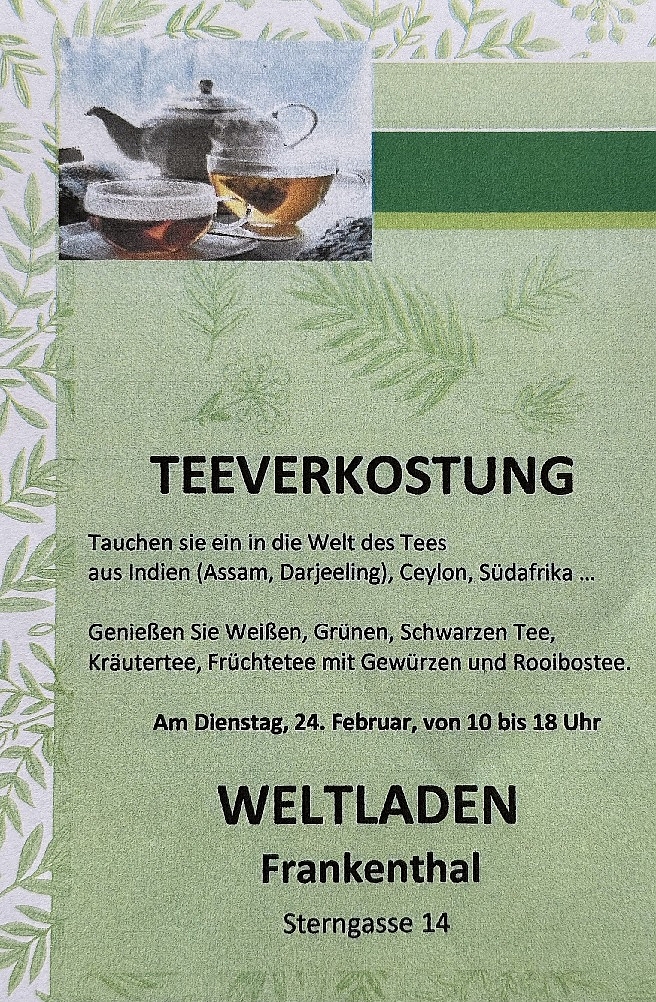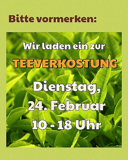 Wir bieten Ihnen an diesem Tag die Gelegenheit, die Vielfalt unseres Teesortiments kennenzulernen und zu verkosten: Weißtee, Grüntee, Schwarztee, Roiboshtee, vielerei Kräuter- und Früchtetees. Wir freuen uns auf Ihren Besuch.